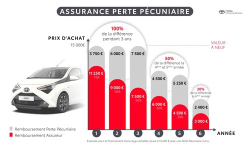 Chez Toyota France Financement, nous vous proposons des assurances complémentaires pour vous permettre de rouler en toute tranquillité. Grâce à notre Perte Pécuniaire, soyez couvert en cas de vol ou de destruction totale de votre véhicule ou d'occasion, grâce à un remboursement total prenant la différence entre le remboursement de votre assureur et le montant du solde du financement.